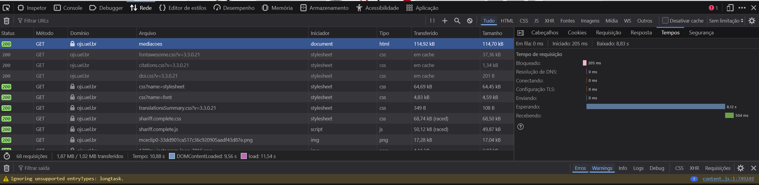 Ele leva de 4 a 20 segundos para carregar o conteúdo inicial das páginas. Otimizei o banco de dados, removi plugins que não estavam sendo usados e desativei plugins que conhecidamente demoram para carregar as informações, reinstalei o OJS na versão LTS, nada disso resolveu o problema que parece estar diretamente ligado ao carregamento das páginas e não aos recursos do servidor.