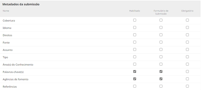 Os metadados fazem parte das Configurações> Fluxo de Trabalho> Submissão> Metadados.